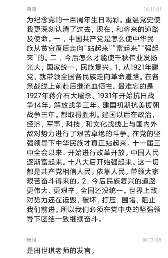 田世琪老师表示重温党史使她更深刻地认清了过去、现在、和将来的道路及使命。从1921年建党开始,党就带领全国各民族走向革命道路,在各条战线上前赴后继流血牺牲。其中最令她难忘的是1927年蒋介石大屠杀、十四年的抗日战争、三年的解放战争和建国初期三年的抗美援朝战争,都在党的领导下取得了胜利。建国以后,在党的带领下,我们国家在政治,经济,军事,科技,和文化战线上与国内外敌对势力进行了艰苦卓绝的斗争。在党的坚强领导下,中国人民逐渐富了起来,中华民族真正站了起来。这一切都是共产党相信人民,依靠人民,带领大家艰苦奋斗得来的。今后民族复兴的道路更伟大,更艰辛,世界上的敌对势力还在打压,阻止我们前进,所以我们必须在党中央的坚强领导下团结一致,继续奋斗!