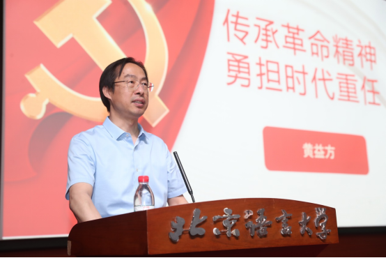 黄益方副校长首先阐述了党史学习教育的总体要求:学史明理,学史增信,学史崇德,学史力行。他强调,新时代青年应当了解学习党史的目的,清楚自己的目标,找准前进的动力。接着,他解读了“红船精神”“井冈山精神”和“长征精神”的丰富内涵,深刻阐述了“传承革命精神”的重要性,强调要学习和领会“坚定信念、实事求是、艰苦奋斗”这一革命精神的核心内涵。在第二部分,黄益方副校长主要围绕“勇担时代重任”,希望新时代北语青年要厚植爱国情怀、锤炼高尚品格、增长知识才干、弘扬奋斗精神。党课中,黄益方副校长结合自身求学成长经历、读书深造经历、多部门工作经历,向同学们生动讲述了终身学习和敢于实践、勇于创新的重要性。