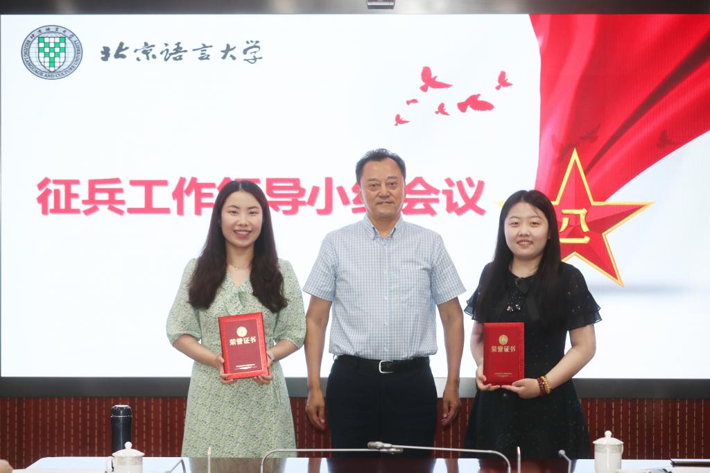 会议最后举行了北京语言大学2020-2021学年度征兵工作先进个人表彰仪式。倪海东书记为获得“征兵工作先进个人”称号的人文社会科学学部辅导员玄铮老师、信息科学学院辅导员徐亦沛老师颁发荣誉证书,鼓励获得表彰的老师们再接再厉,勉励大家以他们为榜样,相互学习,相互配合,进一步增强征兵工作、国防教育工作的责任感,积极为新时代国防军队现代化建设和高校“立德树人”根本任务做出更大的贡献。