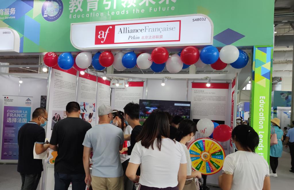 北京法语联盟展台作为中外合作办学以及国际组织的特邀代表,展位力求宣传我校与法国合作方20年来的良好合作与交往,并向大众介绍法语的全球发展趋势。北京法盟展台布置简约、活泼,通过视频、展板、折页、个性化纪念品、有奖游戏等多种形式吸引参展人员,宣传自身优质的线下、线上面向成人和青少的各类法语课程,“法语+”课程及跨文化活动,法语水平考试以及北京法盟为中法企事业单位提供的教育服务项目。其中综合法语融合课程符合时代发展趋势,充分体现智慧教育新技术的运用,受到大众和众多机构的关注。