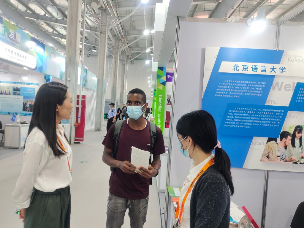 北京语言大学展台由国际学生招生处组织策划,联合学校孔子学院事业部、国际合作交流处、语言资源高精尖创新中心、网络教育学院等单位,共同展示学校在汉语教学、语言资源系统研发、线上线下融合教育等方面的特色和优势,集中体现了线上线下教育常态化融合发展的最新成果。国际学生线上教育课程通过直播面授的方式,精准对接不同时差、国家和专业背景的多元学习需求,充分发挥根据汉语水平量身定制课程的优势,借助丰富的在线学习平台和资源,使课堂教学和学生课后自主学习得以高效有序便利进行。北语展台通过丰富多彩的多媒体视频、照片、宣传材料和系统平台现场展示,吸引了中外教育机构和访客的深入关注和合作咨询。