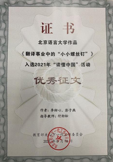 近日,我校关工委推选作品《家国赤子,初心永怀》、《翻译事业中的“小小螺丝钉”》被评为教育部关心下一代工作委员会2021年“读懂中国”活动优秀征文。