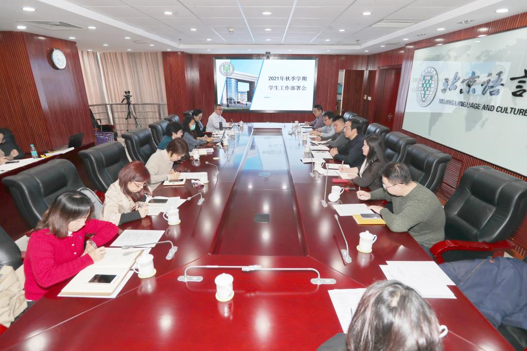 10月13日上午,我校在综合楼909会议室召开2021年秋季学期学生工作部署会。北京语言大学党委常委黄益方副校长出席,学工部及各学部院系本科学生工作负责人、辅导员老师参加,会议由学工部部长黄展主持。