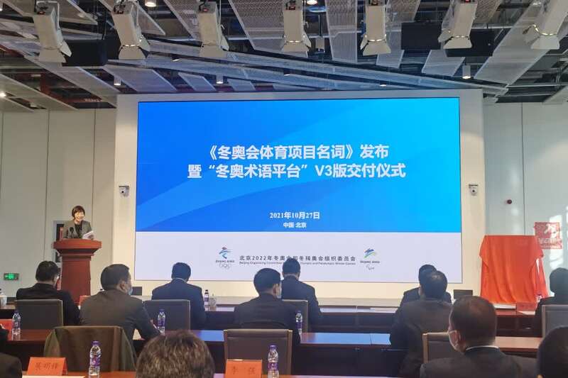 10月27日下午,在北京冬奥会倒计时100天之际,北京冬奥组委在京举办《冬奥会体育项目名词》发布暨冬奥术语平台V3版交付仪式。《冬奥会体育项目名词》和冬奥术语平台收录的名词涉及北京冬奥会和冬残奥会全部竞赛项目,覆盖中、英、法、日、韩、俄、德、西班牙八个语种。