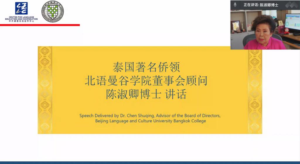 泰国著名侨领、北京语言大学曼谷学院董事会顾问陈淑卿博士在发言中提到目前中国科技突飞猛进,已成为世界的强国,学会中文极为重要。她赞扬秋令营的举办让历史悠久的中华文化在国际上传扬,使泰国青少年感受到中华文化丰富多彩,增强了中泰两国的友好关系,并热烈祝贺本次秋令营取得圆满成功。