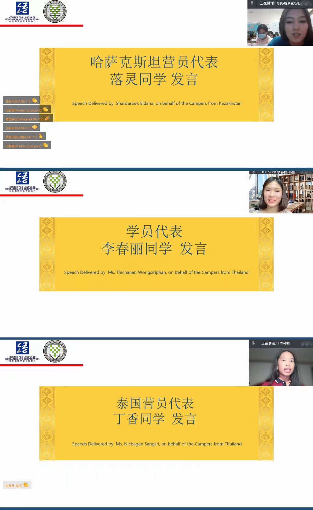 “这次学习,对我来说,是一次难忘的充电机遇。”营员代表哈萨克斯坦学生落灵说。她在发言中感谢本次秋令营为营员们搭建的学习平台,让营员们在秋天这个丰收的季节收获了丰富的知识,使大家“学有所获,学有所思,学有所成,学有所用”,表示一定不辜负老师们辛勤的付出与教导。泰国学生李春丽是第一次参加秋令营,虽然因疫情的原因无法到北京参观和体验,但秋令营打破时空的线上实景教学让她有了身临其境之感。泰国学生丁香在发言中说,她坚信“你和优秀的人差的不是智商,是努力”,强调一定要努力抓住每一个学习汉语的机会。