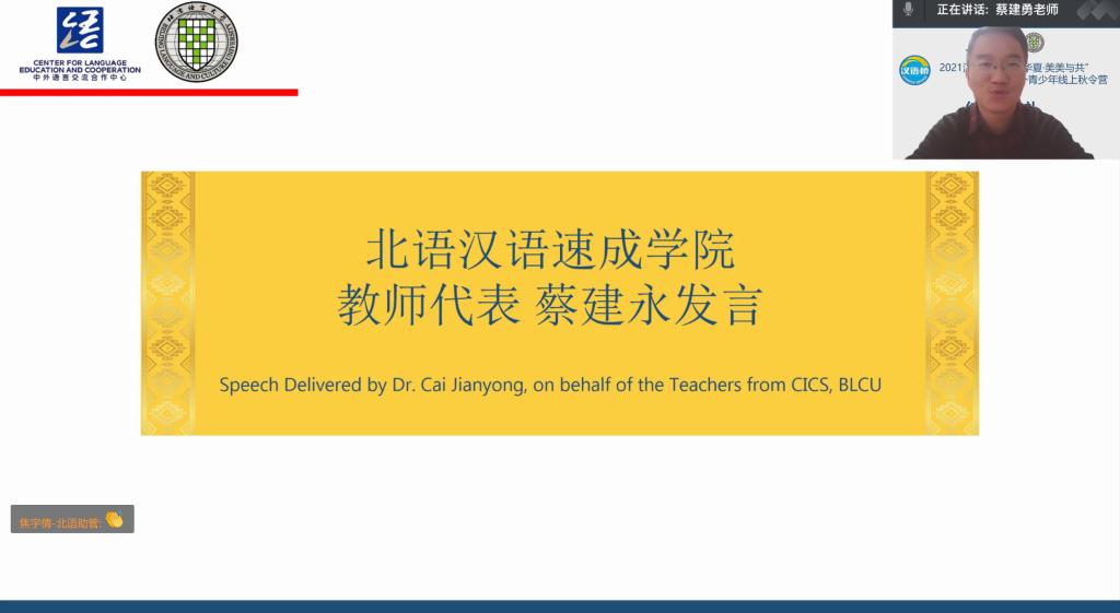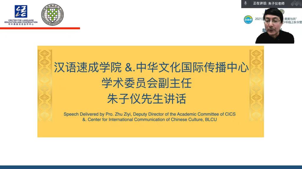 汉语速成学院学术委员会朱子仪副主任在致辞中,首先对圆满完成在线学习和体验的营员们表示了热烈祝贺,并向给予项目大力支持的中国教育部中外语言交流合作中心、参与此次项目的全体成员及领队老师们的辛勤付出表示了衷心感谢。接着回顾了为本次海外青少年秋令营量身定制的项目内容及实施过程。指出这次线上的发现和感悟之旅为营员们打开了一扇进入汉语言文化广阔天地的大门,相信参加这次线上秋令营的同学们一定会珍惜这次难忘的经历,珍惜取得的收获。