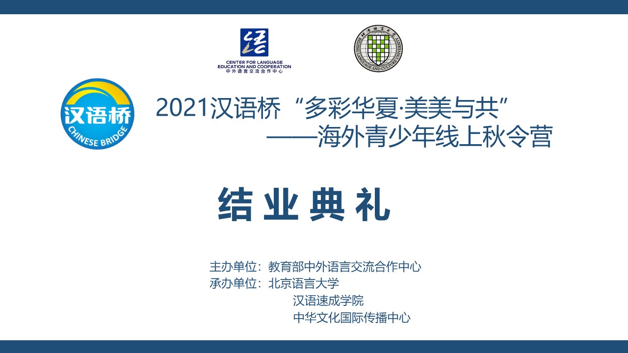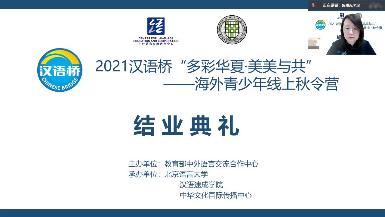 10月29日下午,为期10天的2021 汉语桥“多彩华夏,美美与共”海外青少年线上秋令营举行了隆重的线上结业典礼。本次秋令营由教育部中外语言交流合作中心主办,北京语言大学汉语速成学院和中华文化国际传播中心联合承办。北京语言大学汉语速成学院院长苏英霞、汉语速成学院和中华文化国际传播中心学术委员会副主任朱子仪、国际学生招生处处长周鑫、北京语言大学泰国代表处主任于美英、项目组教师,来自泰国和哈萨克斯坦相关院校和教育机构的领导及120余名师生相聚云端,参加了线上结业典礼。结业典礼由汉语速成学院“汉语桥”项目主管魏耕耘老师主持。