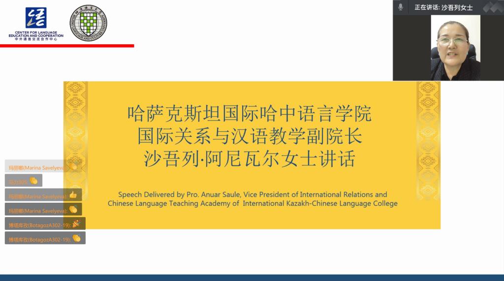 哈萨克斯坦国际哈中语言学院国关与汉语教学副院长沙吾列·阿尼瓦尔女士首先向为本次秋令营付出辛劳的领导和老师们致谢,大力称赞秋令营活动内容丰富多彩,妙趣横生,给大家留下了美好的回忆,她用“我参与,我快乐,我展示,我精彩”这句话概括了同学们在秋令营中的精彩表现。