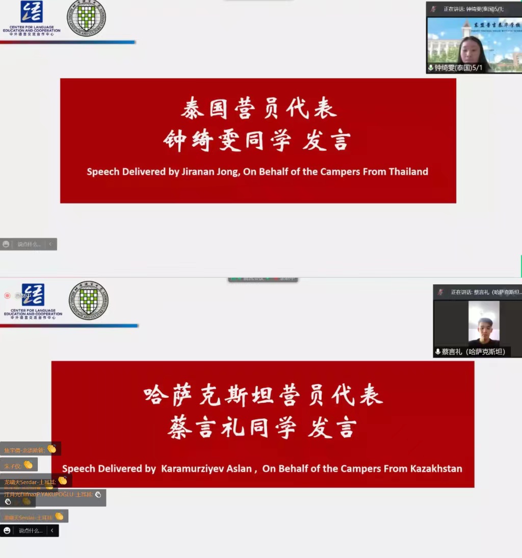 泰国学生钟绮雯用“不枉此行”这个成语来总结这次学习之旅,这次不同寻常、不同以往的线上体验拉近了自己与中国的距离,增强了自己去中国学习的信念,希望在不远的将来能到北京语言大学,亲身感受小联合国多元文化的魅力。“谢谢老师们,从这儿学到的知识将使我们终生受益”,来自哈萨克斯坦的蔡言礼说。许多营员都表示这次“汉语桥”线上秋令营是一次可遇不可求的机会,在这里不但收获了知识,还收获了友谊。