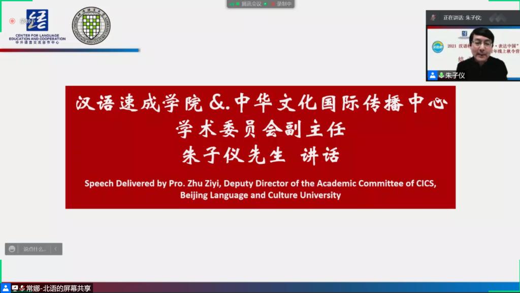 汉语速成学院学术委员会朱子仪副主任在讲话中,首先对圆满完成在线学习和体验的三国青年学子表示了热烈的祝贺,并向给予项目大力支持的中国教育部中外语言交流合作中心、参与此次项目的全体成员及领队老师们的辛勤付出表示了衷心感谢。在大家的共同努力下,这次秋令营为大家打造了轻松愉快又有满满获得感的汉语言文化体验和感悟之旅。他希望营员们把这里学到的知识、听到的“中国的故事”、得到的感悟分享给家人和朋友们。