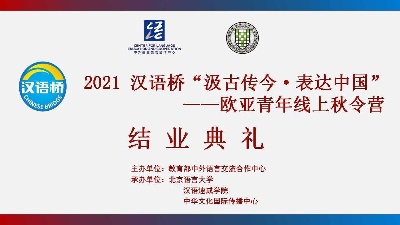 2021汉语桥“汲古传今·表达中国”欧亚青年线上秋令营在师生们依依话别中落下帷幕,希望各国青年在“汉语桥”这座友谊之桥上携手并肩,行稳致远,进而有为,为促进中外交流与文明互鉴贡献自己的智慧与力量。