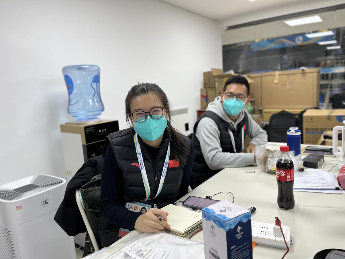 我校语言服务领域的志愿者董婧怡(左)、乔仝乐(右)已进入闭环区工作