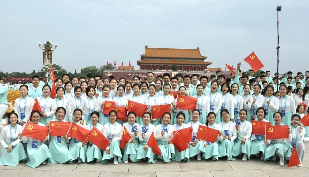 中国共产党成立100周年大会于7月1日在北京天安门广场隆重举行。北京语言大学积极响应党的号召,选派师生代表参加庆祝大会当天的广场合唱活动。艺术学院在本次广场合唱中参与人数众多,是北语这次活动的主干力量。辅导员杨柯老师和声乐教师金珂宇老师作为带队老师,和25名艺术学院学生历时3个月,共同参加18次校内训练、16次校外联合训练,同学们既要完成训练任务,还要保证完成校内的学习任务,克服训练强度大、集体训练白天暴晒、夜晚寒冷等困难,以专业的演唱状态和饱满的情绪情感完成每首作品的表演。庆祝大会举行当天,同学们激动的心情难以抑制,大家热情表示,“作为生在红旗下、长在春风里的孩子,能够亲身见证建党百年庆祝大会的光荣与伟大,是何其幸运”;“当和大家一起呼喊‘请党放心,强国有我’时,当再次听到《歌唱祖国》的前奏响起时,我们都欢欣雀跃、热泪盈眶”。