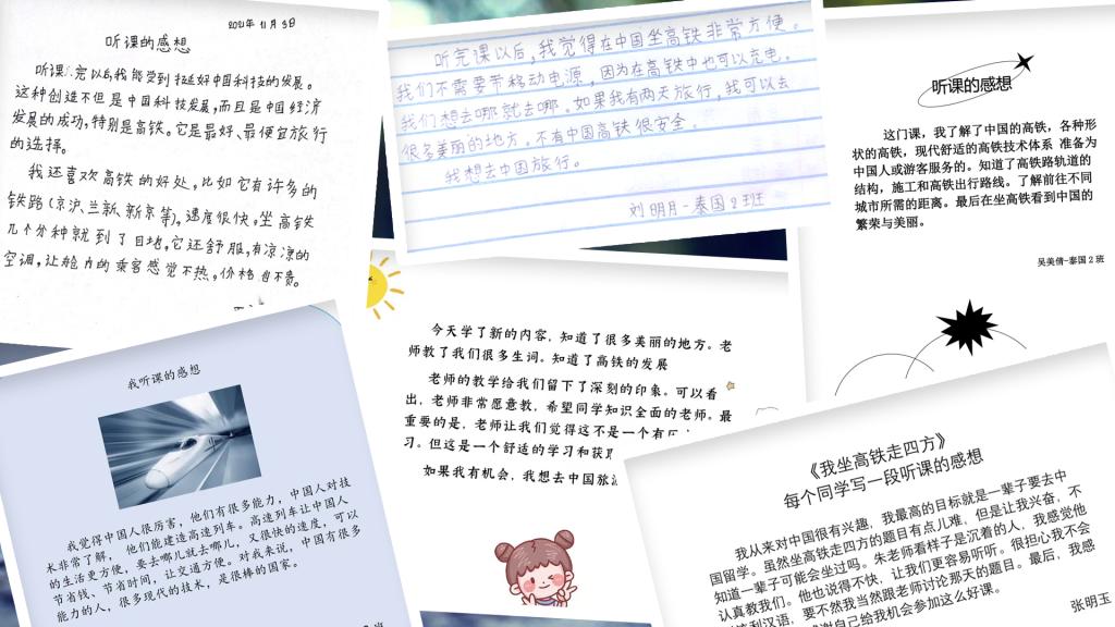 学员们也用深情的感言和美丽的图画表达对中国文化的热爱、对中国建设成就的向往和促进文化交流的愿望。学员昀舒写道:“作为一个很喜欢中国建筑的人,看到胡同以后,我无法用语言表达我的感觉,因为它给我留下了很深刻的印象,它的风格非常吸引眼球。真希望有一天我能有机会参观如此迷人的地方。”学员吴思思写道:“我觉得中国人很厉害,他们能力非凡。中国人掌握了先进的技术,他们能建造高速列车。高速列车让中国的交通更通达,让中国人的生活更方便,想去哪儿就去哪儿,而且以飞快的速度,可以节省钱和时间。”学员林飞鸿在听课之后认识到“中国是一个在今天取得了巨大飞跃的国家,它也是世界上非常强大的国家”。