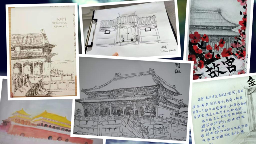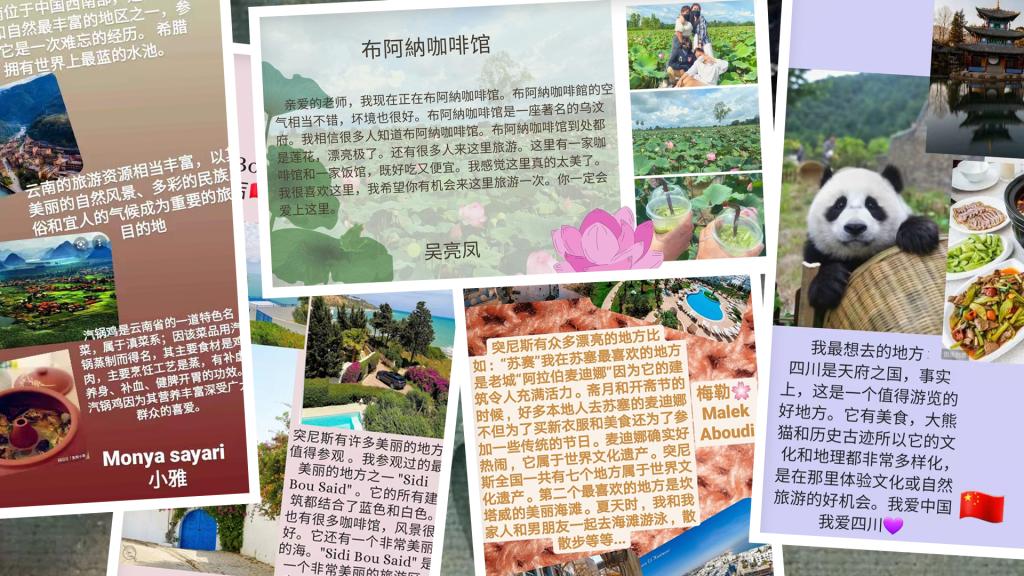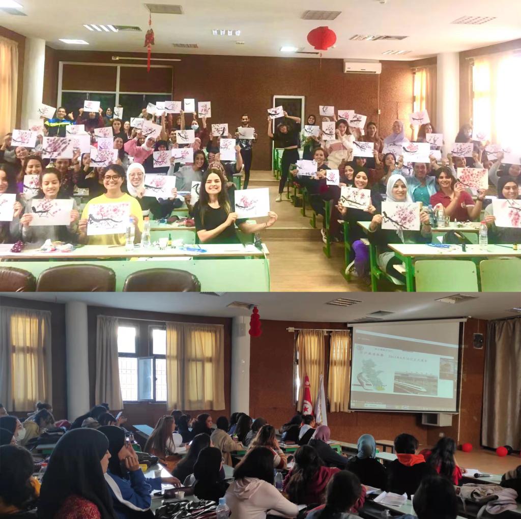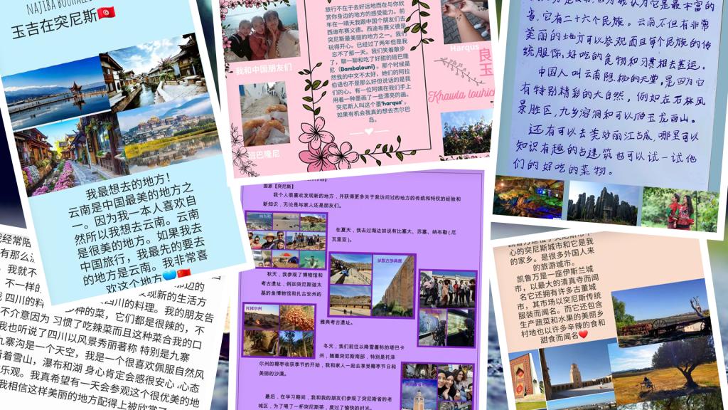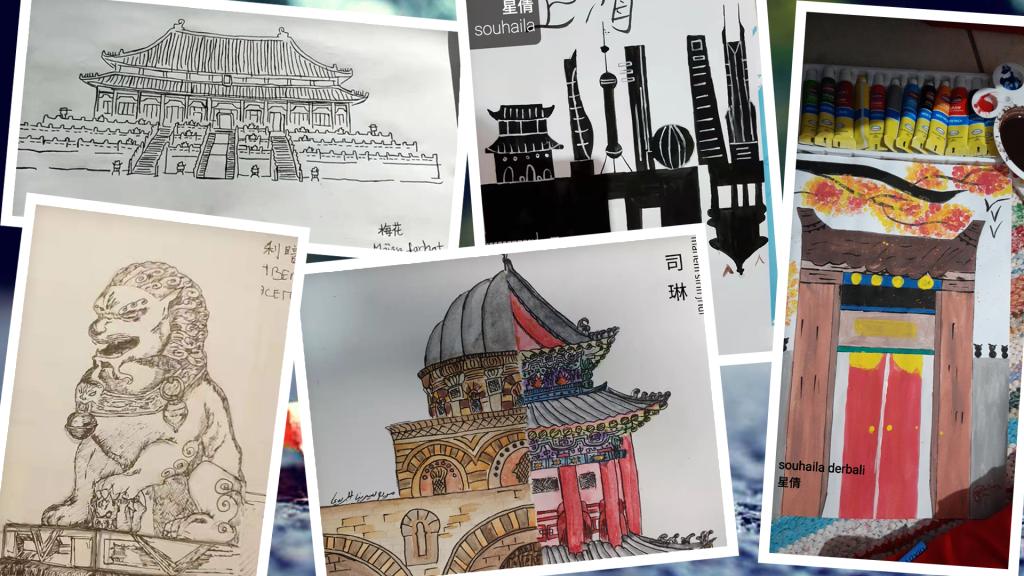 喜欢绘画的学员还通过描绘故宫的建筑、胡同的宅门、北京和上海两座城市的地标、象征君子美德的梅兰竹菊,甚至绘制中国茶主要产区地图来领略中国韵味。学员善柔画了一幅中国传统门的样式与突尼斯传统门样式的对照图,不同的文化表达一目了然。学员思颖将中国景观与突尼斯景观组合在一起,用同一种鲜花加以围绕,看上去是那么安宁、和谐。学员司琳更是在图画中将突尼斯的著名古迹与中国传统建筑进行拼接。她们都是在用画笔表达出促进不同文明的沟通与交流互鉴的真挚而美丽的愿望。