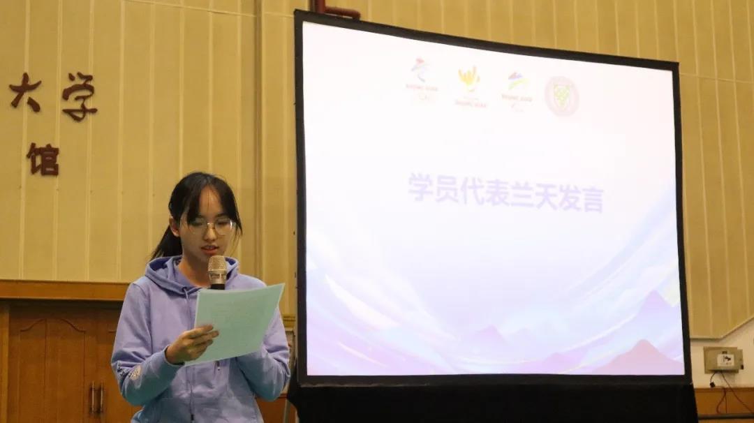 学员代表兰天同学表达了对于冬奥会志愿服务的期待。她表示本次培训帮助志愿者们更好地掌握冬奥知识与志愿服务技能,为圆满完成任务奠定了基础。她号召大家一起迎冬奥,一同书写无悔的青春篇章。
