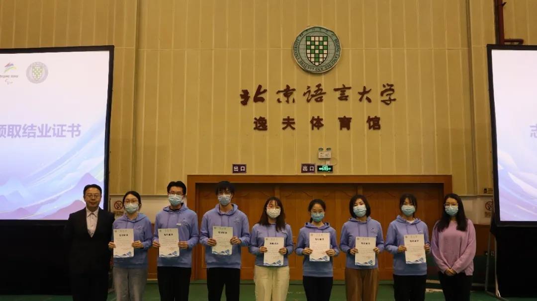 11月21日晚,北京语言大学冬奥志愿者顺利完成了通用技能培训全部科目。校团委书记杨天乔老师和校团委邹泺铱老师为志愿者代表颁发了结业证书。