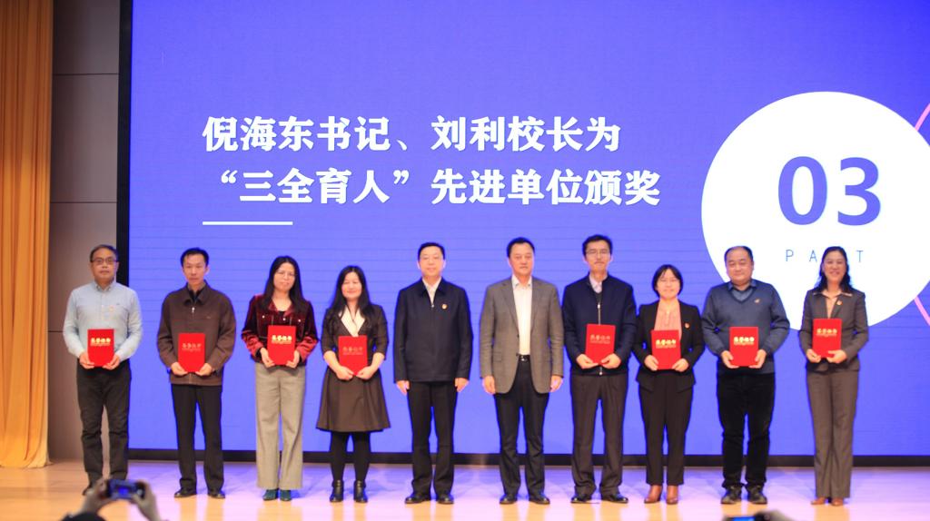 倪海东书记、刘利校长为荣获“三全育人”先进单位的汉语国际教育学部、外国语学部、人文社会科学学部、中国文化研究院、教务处、学工部(学生处、校团委)、研究生院、后勤服务集团8个单位颁发了获奖证书。黄益方副校长宣读了“三全育人”先进单位名单和事迹。