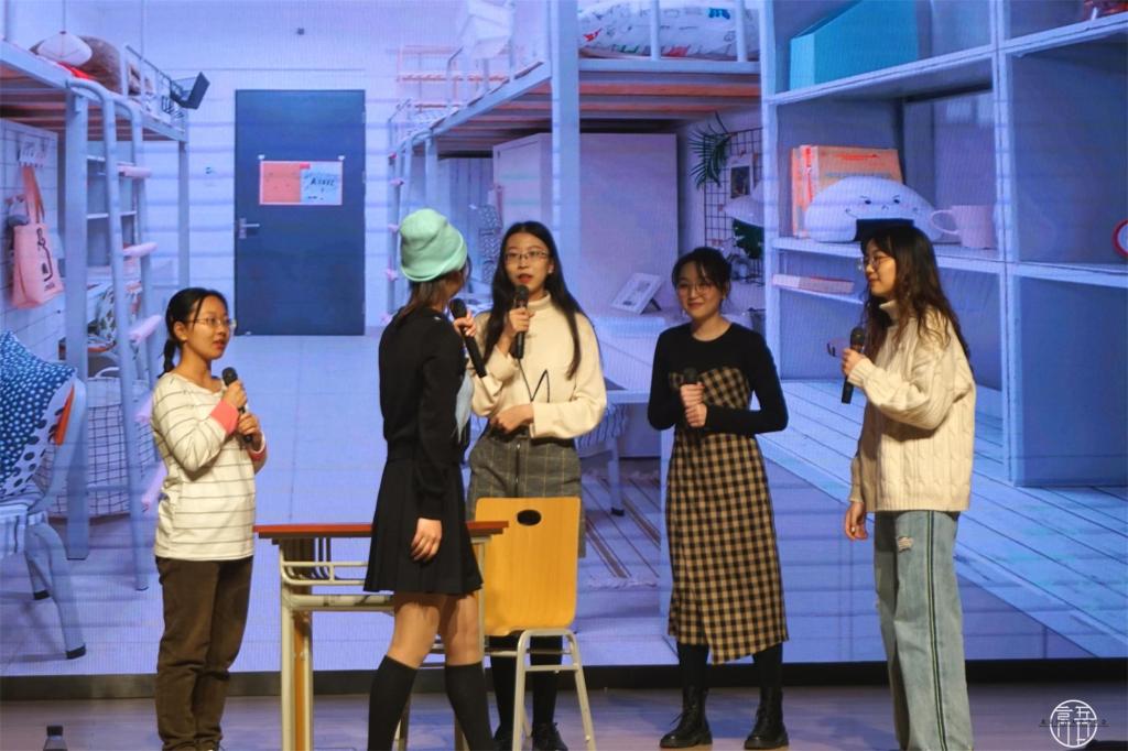 在十强寝室依次亮相后,第九届公寓文化节暨寝室风采大赛决赛正式开始。首先上场的10#307寝室,以诙谐幽默的小品《青春北京,冬奥有我》展现了北语青年助力冬奥的风采,表达了对冬奥会的期待与祝愿;接下来的10#722寝室通过情景剧《Drama小剧场》展现了五个女孩从相识到相熟,相携成长直到毕业的过程,珍贵的友谊令人感动;10#236寝室随后上场,饱含深情的双语朗诵《请党放心,强国有我》传达出了当代青年“奋斗正青春,青春献给党”的坚定志向;10#717寝室给现场观众带来了一场别开生面的“寝室冬奥会”,并以歌曲《有种》结束表演,以祝愿北京冬奥会圆满成功;接着,11#208寝室的《赤伶》以浓郁的家国情怀为线索,塑造了一位乱世中位卑未敢忘忧国的戏剧艺术家形象,给观众留下了深刻印象。