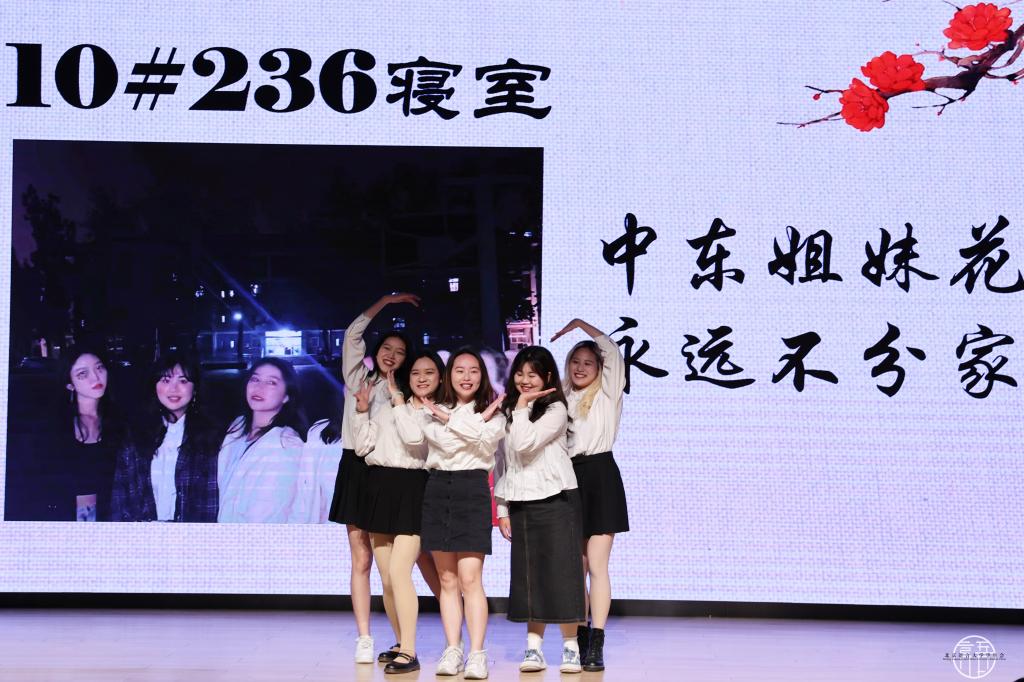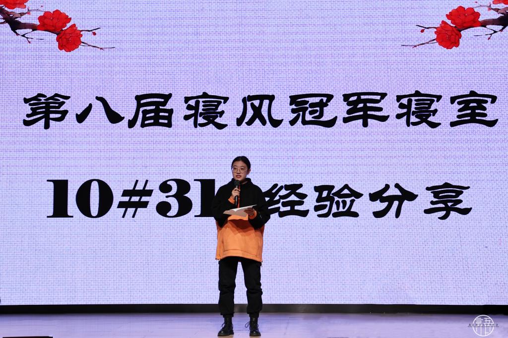 前五组寝室表演完成后,第八届公寓文化节冠军10#318寝室代表上台分享了去年寝风大赛中的经历和心得。她回顾了参与寝风大赛的心路历程,希望同学们珍惜寝室的友谊,并预祝寝风决赛圆满成功。