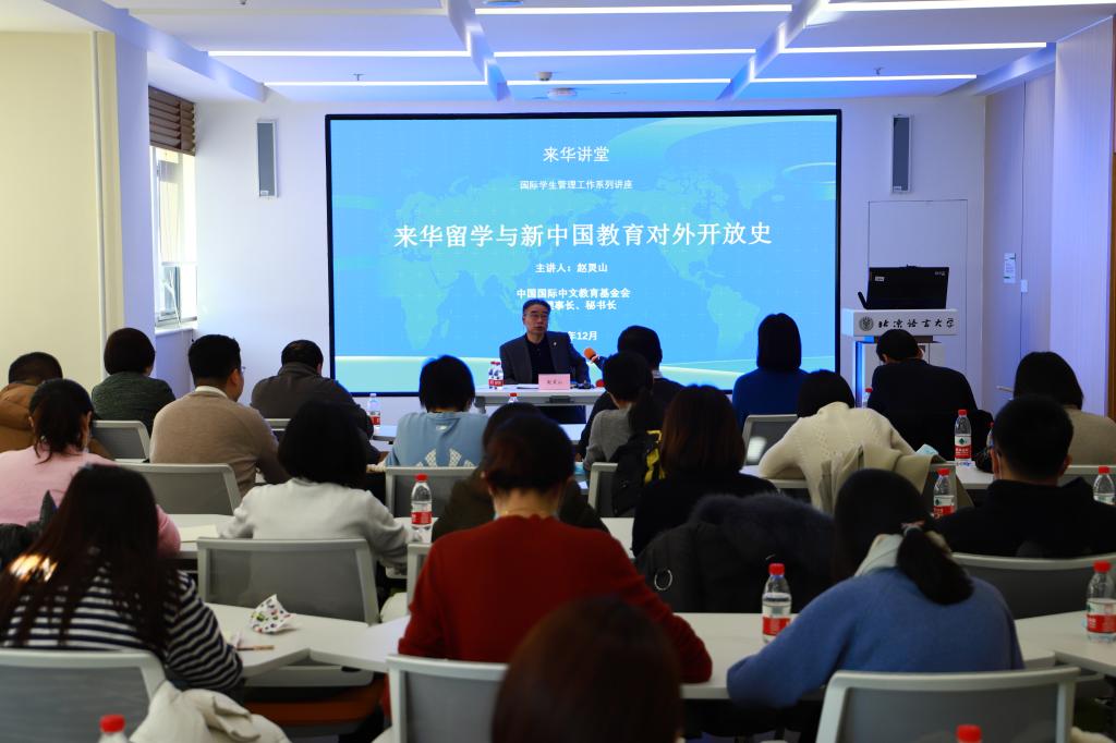 12月1日下午,由国际学生管理处主办的“来华讲堂”国际学生管理工作系列讲座之“来华留学与新中国教育对外开放史”专题讲座在北语图书馆日新讲堂举行。
