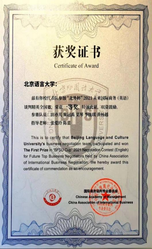最终,北京语言大学代表队出色地完成了本次比赛,荣获团体一等奖。队伍的指导老师张爱玲教授、陈蕾副教授荣获“优秀指导奖”,李佳琪同学获得“最佳谈判手”称号,黄杨越同学获得“优秀谈判手”称号。