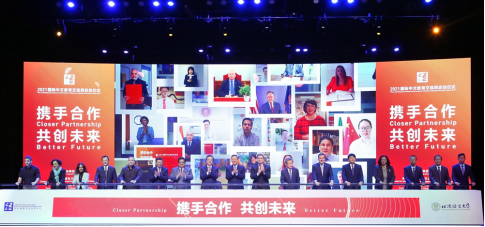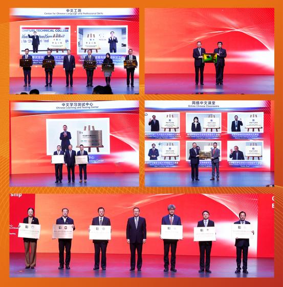 此外,一批中文学习测试中心、网络中文课堂、语合智慧教室、中文工坊、国际中文教育基地和中文教师学院正式设立,田学军向现场部分中外院校、企业和机构代表授牌,展现出多主体、多层次共同参与的国际中文教育新业态。授牌仪式结束后,中外嘉宾一起上台携手推动启动杆,共同启动2021国际中文教育交流周。