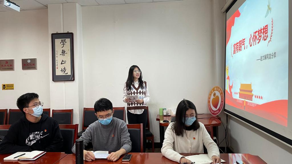 支部党员在前期专题学习的基础上,从自身学习、实践出发,汇报心得、交流感想。卢俐廷同学带领支部党员回顾了支部理论学习情况,重点总结了支部深入学习贯彻党的十九届六中全会精神、习总书记“七一”重要讲话精神等内容,进一步巩固了支部学习效果。孔德伍同学分享了参加庆祝中国共产党成立100周年大会的经历,讲述在合唱的训练过程中以及正式演出带给自己的震撼和激励,并结合自己担任学生干部的实际,谈了对习总书记重要讲话精神的学习感想。赵文琳同学表达了作为北语献词团的一员,亲历建党一百周年伟大时刻的自豪,以及作为今年入党的新党员参加学校组织的入党宣誓活动时的激动,表示作为青年党员要加强学习、不辱使命。黄鑫同学结合自己参与组织学院以乡村振兴为主题的营销大赛的经历,谈了对“助力乡村振兴,赋能小微企业”的理解,并通过讲述该比赛的立意与效果,倡导青年学子继续为乡村振兴贡献力量。最近刚参加完冬奥测试赛志愿活动的秦毓泽宏同学,讲述了自己与冬奥会结缘并筑梦的故事,并结合对党的十九届六中全会精神的学习感悟,表达了肩负重任、砥砺奋进的决心。