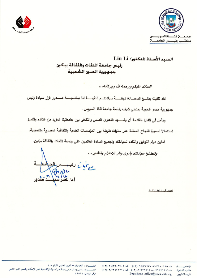 刘利校长在贺电中表示,祝贺纳赛尔校长履新,希望两校在“中非高校20+20”合作框架下,通过孔子学院,继续加强学术合作和文化交流,携手并肩,共同进步,在未来取得更大的成就,不断深化中埃两国人民友谊。