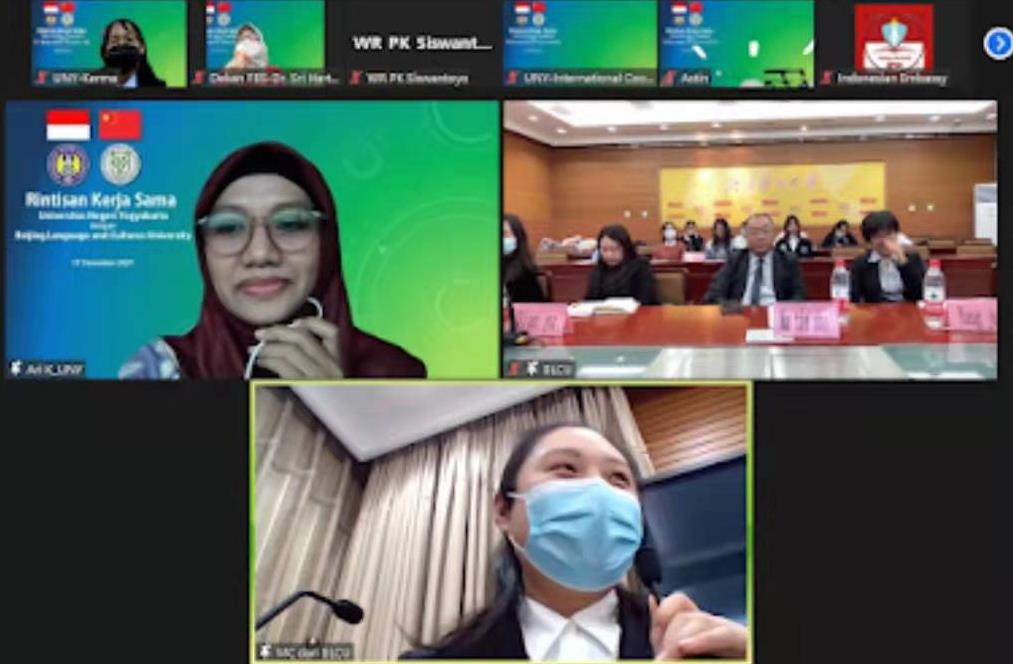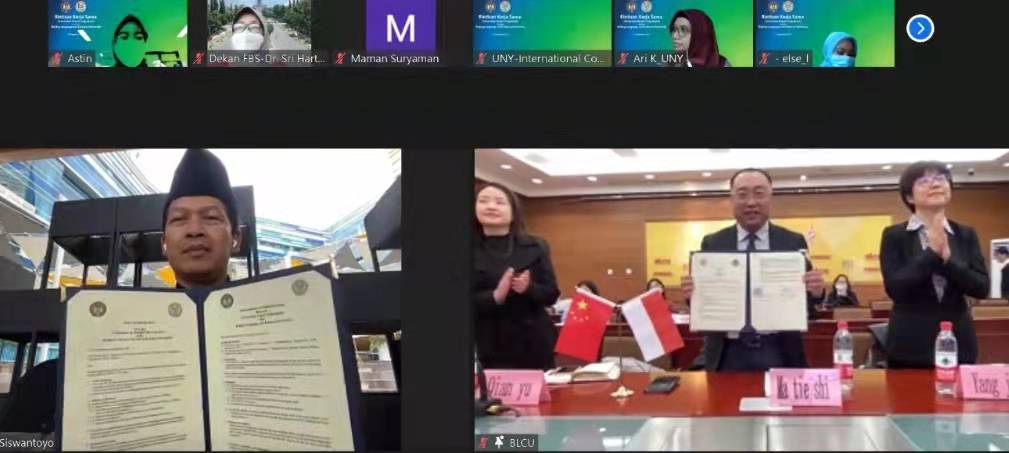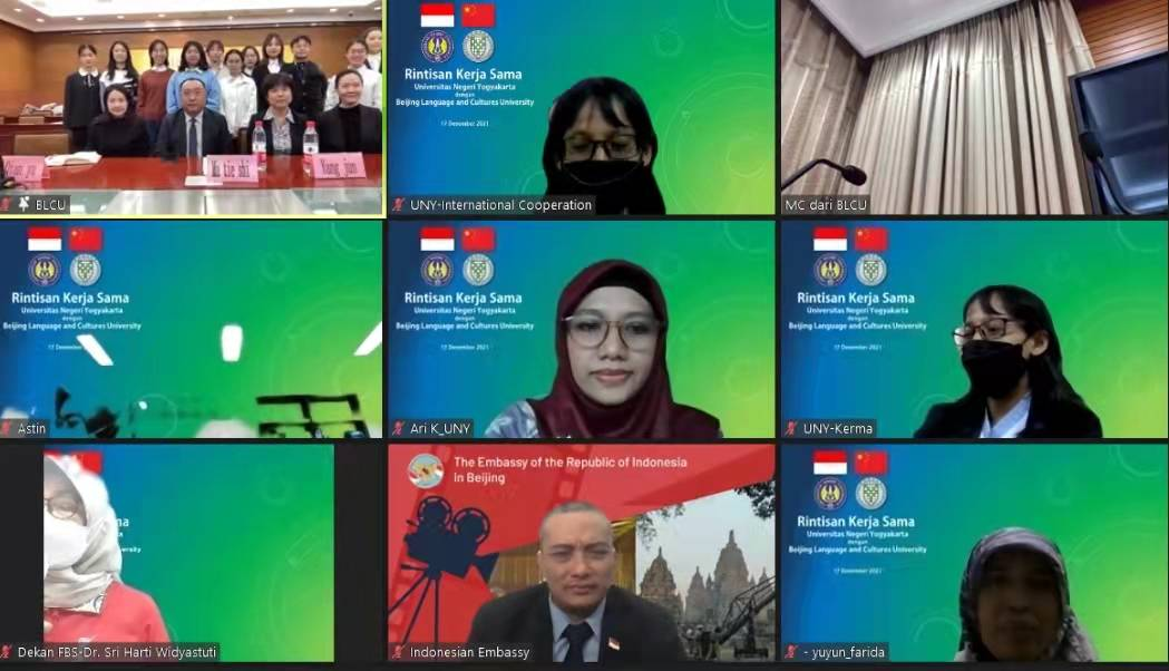 12月17日下午,我校与印度尼西亚日惹国立大学通过线上形式举办合作协议签署见证仪式及两校友好会面活动。这是自我校印尼语系成立以来,签署的第一份以师生交换、联合学术科研为目的的合作协议。印尼日惹国立大学合作与规划副校长Siswantoyo教授、语言和艺术学院院长Sri Harti博士、国际合作处负责人Faqih博士、对外印尼语教学协调员Ari博士等工作人员及印度尼西亚驻华大使馆相关人员共同出席此次友好会面活动。