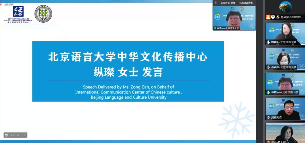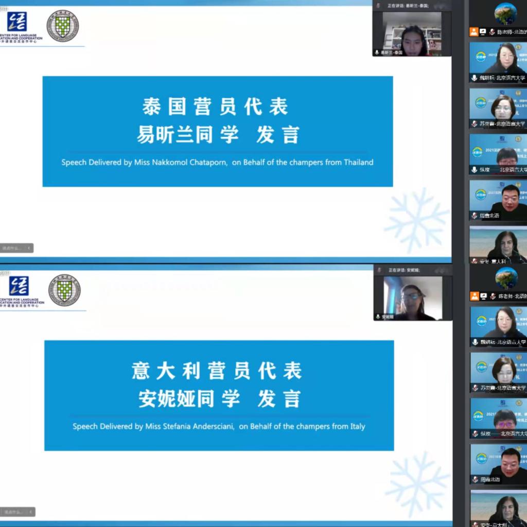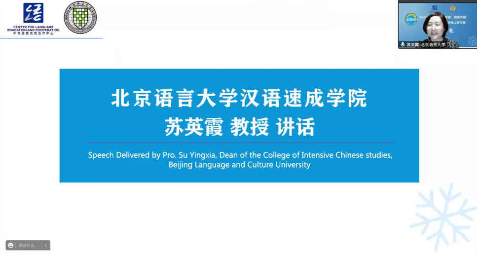 日前,由教育部中外语言合作交流中心主办,北京语言大学汉语速成学院和中华文化国际传播中心承办的2021汉语桥“精彩冬奥•健康中国”青少年线上冬令营项目圆满结束。北京语言大学汉语速成学院院长苏英霞、国际学生招生处处长周鑫、北京语言大学泰国代表处主任于美英、项目组教师,来自菲律宾、马来西亚、泰国相关院校和教育机构的领导、领队老师及营员们云端聚首,参加了线上结业典礼,共同见证了冬令营的完美收官。结业典礼由汉语速成学院“汉语桥”项目主管魏耕耘老师主持。