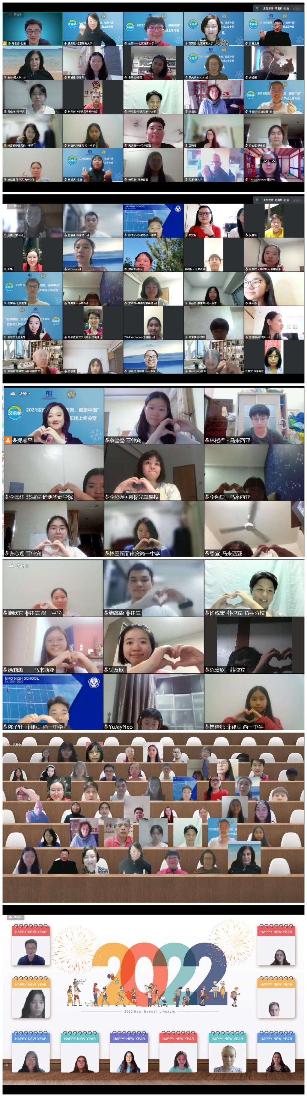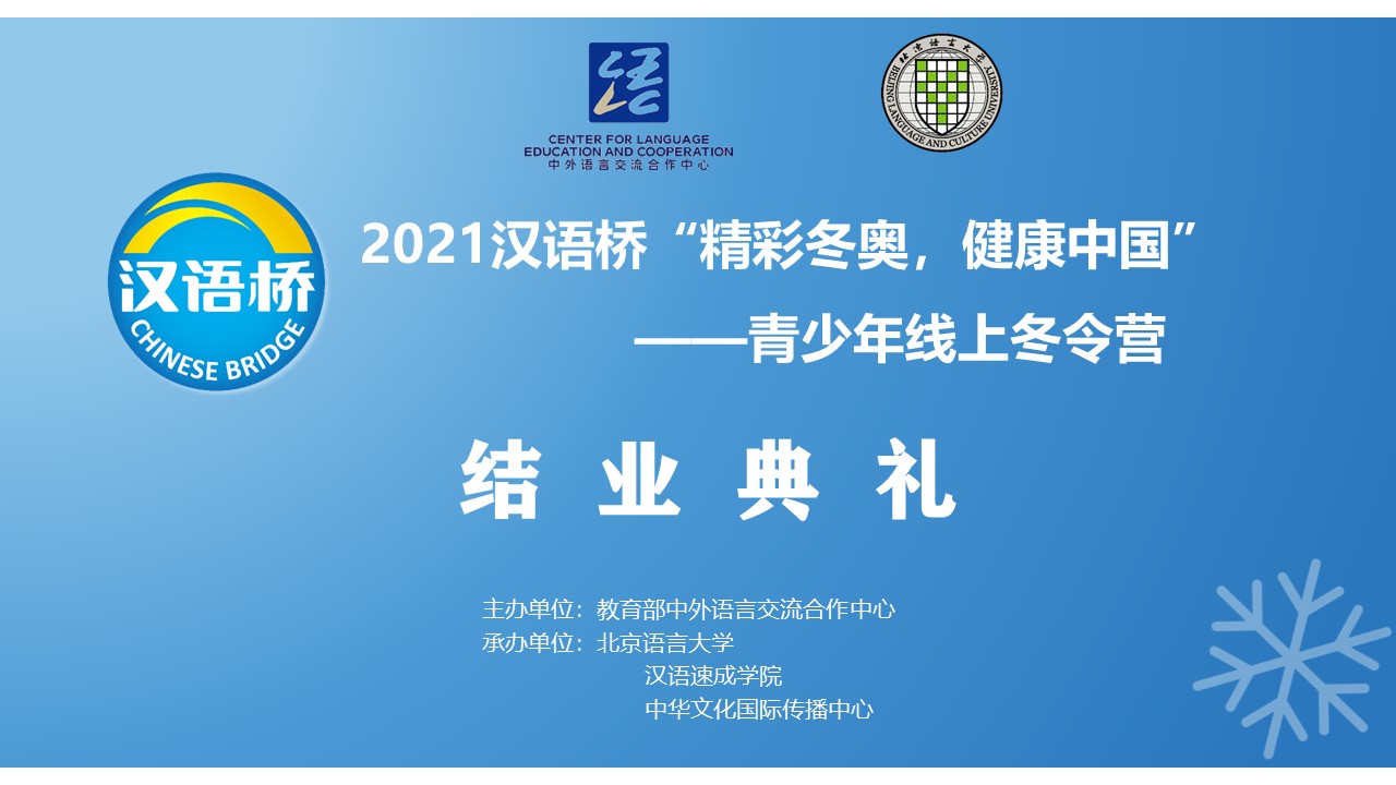 2021汉语桥“精彩冬奥·健康中国”青少年线上冬令营在师生们的依依不舍中落下帷幕。疫情期间,我们的线上教学模式不但满足了外国学生期盼学习汉语、了解中国文化的愿望,而且大大提升了教学手段的智能化和智慧化,使教学体系更为完备、课程更为丰富,最大限度地满足了学生的学习需求。运动和健康让我们的生活更美好,“冬奥与健康”主题冬令营把营员们紧紧联结在一起,书写出友谊、和谐、向上的美好篇章,彰显着“更高、更快、更强、更团结”的奥运精神。“汉语桥”以中文为桥,向世界播撒和平与与友谊的种子。汉语为桥,天下一家,美美与共,一起向未来。