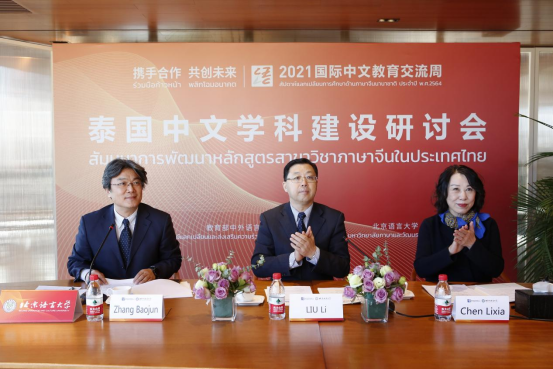 12月17日上午,由中外语言交流合作中心和北京语言大学共同主办的2021年泰国中文学科建设研讨会在北京语言大学顺利召开。作为21世纪海上丝绸之路的重要节点国家,泰国的中文教育正朝着更高质量方向发展。本次研讨会围绕“携手合作、共同发展”的主题,通过线上方式,围绕构建泰国中文学科建设的新模式、完善泰国本土中文师资培养聘任机制两个议题举行。语合中心主任马箭飞、泰国高等教育与科研创新部次长思瑞拉·宋斯维莱、北京语言大学校长刘利、清迈皇家大学校长查里·马尼哥松、泰国海上丝路孔子学院理事会主席颂德通猜副僧王出席开幕式并致辞,中泰两国35家高校、机构参加会议。