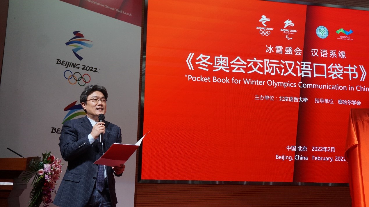 刘利校长在致辞中说,作为以语言文化教育与研究为特色和优势的多学科国际性大学,开展了“冬奥会语言服务行动计划”。在北京冬奥会倒计时100天之际,北京冬奥会组委会举办了《冬奥会体育项目名词》发布暨冬奥术语平台V3版交付仪式。这个由北语完成的语料库,是目前世界上规模最大的多语种 冬奥语料库;设计和制作冬奥会志愿者通用培训必修课程《常见中文知识》;发布《北京冬奥会语言服务大数据报告》;举办以冬奥为主题的“新媒体里的趣味冬奥”、“筑梦冰雪、相约冬奥”等“汉语桥”线上冬令营,做了大量工作。他说,在国家语委支持下编写的这套《冬奥会交际汉语口袋书》是学校助力冬奥、服务冬奥的又一个重要贡献。他表示,冬奥会开幕在即,北京语言大学携手察哈尔学会,向北京冬奥会以及张家口市政府捐赠该书4万册。同时,也将把《冬奥会交际汉语口袋书》提交至北京奥运博物馆,将其成为永久保存的奥运藏品、奥运遗产、奥运记忆。