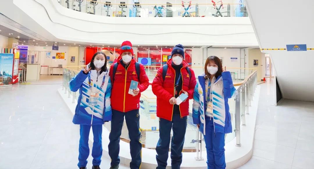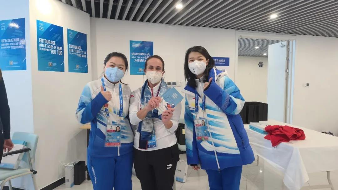 蒙古代表团的官员巴雅图雅是北京语言大学校友,曾于2005-2007年间在北京语言大学学习中文。带队教师玄铮和NOC助理孙维茁一起把口袋书赠送给她,她开心道谢,笑着表示会继续努力学习中文,“当年我只学过两年,现在中文还不是太好,平日里跟助理们基本都是说英文。”她夸奖北语志愿者们工作做得非常好,给了她很多帮助和温暖。玄铮老师表示今年是北语校庆60周年,欢迎她随时回到中国、回到北语。玄铮、毛星月两位老师还将《冬奥会交际汉语口袋书》分享赠送给了国际奥委会官员,对方十分开心并表达了谢意,还表示会与身边人一起分享。