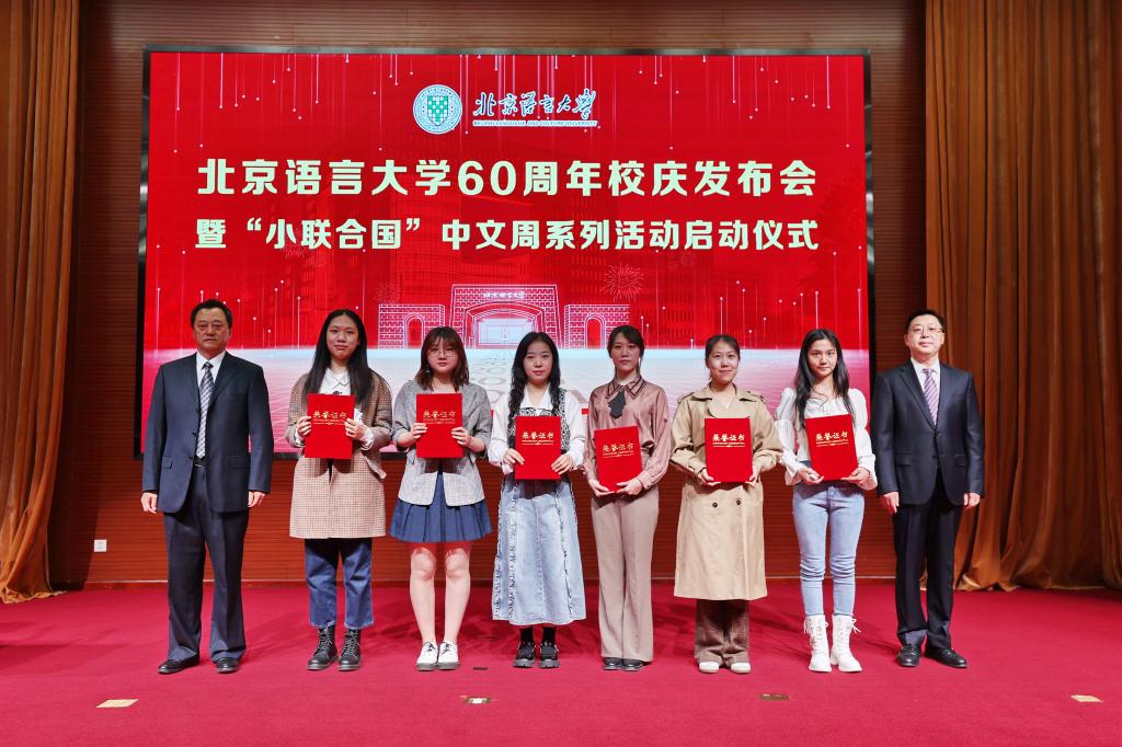 上午八时三十五分,倪海东书记、刘利校长共同发布北京语言大学60周年校庆主题和标识,并为校庆主题和标识征集活动获奖者颁奖。校庆主题为“讲述中国 亲睦世界”,具体释义:北京语言大学在国家对外交往的大局中应运而生,毛泽东主席亲笔题写校名,周恩来总理亲自主持筹建。60年来,学校不负党和国家重托,秉承“德行言语 敦睦天下”的校训,为中国和世界184个国家及地区培养了近30万通晓中外语言文化的高素质专业人才。遍布全球的北语人,既是中国故事的讲述者,也是中国人民与世界人民友好往来、和睦相处、交流互鉴的亲历者和实践者。讲述中国,亲睦世界,正是北语人不断砥砺奋进的生动写照。值此校庆之际,学校携手全球校友,勇毅前行,开创未来,为推动构建人类命运共同体作出新的更大贡献。