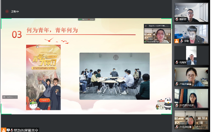 为喜迎中国共产主义青年团成立100周年,激励引领广大团员青年不忘初心敢拼搏,牢记使命勇担当, 5月10日下午,校党委书记倪海东深入基层联系商学院班级,参加了21级经济学班“峥嵘百年史,砥砺青年行”主题班团建设活动(线上)。