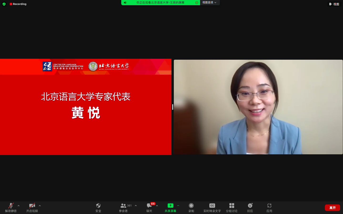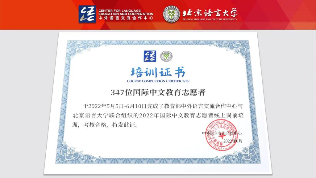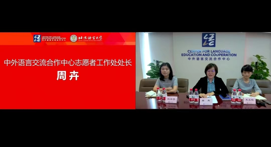 中外语言交流合作中心志愿者工作处处长周卉对347名志愿者加入国际中文教育大家庭表示欢迎。希望大家“不忘初心,因地制宜,深入探索适合当地的教学方法”,在赴任国能“遇到更好的未来”并且“平安归来”。周处长对本次培训予以肯定,对北京语言大学的培训专家和工作人员表示感谢。最后由周卉处长为347名志愿者颁发了培训证书。