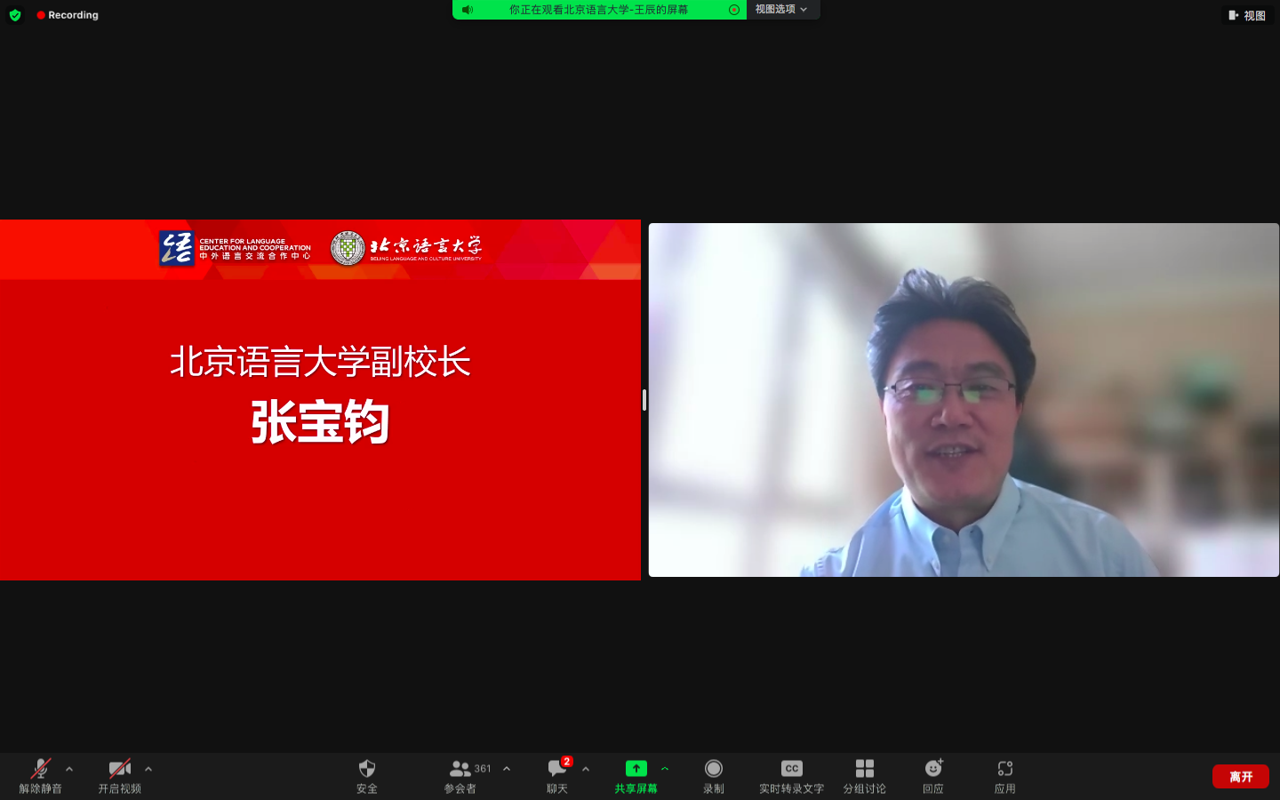 张宝钧副校长对347名志愿者顺利完成培训表示热烈祝贺,他希望志愿者们“以家国为使命,长存敢为天下先的勇气,在赴任国完成教学任务的同时,成就自己的理想和事业,为国际中文教育事业的发展贡献才智。”他说,各位学员也是北语的校友,学校将是大家工作进步和事业发展的坚强后盾,并邀请大家积极参加北语六十周年校庆的系列活动。