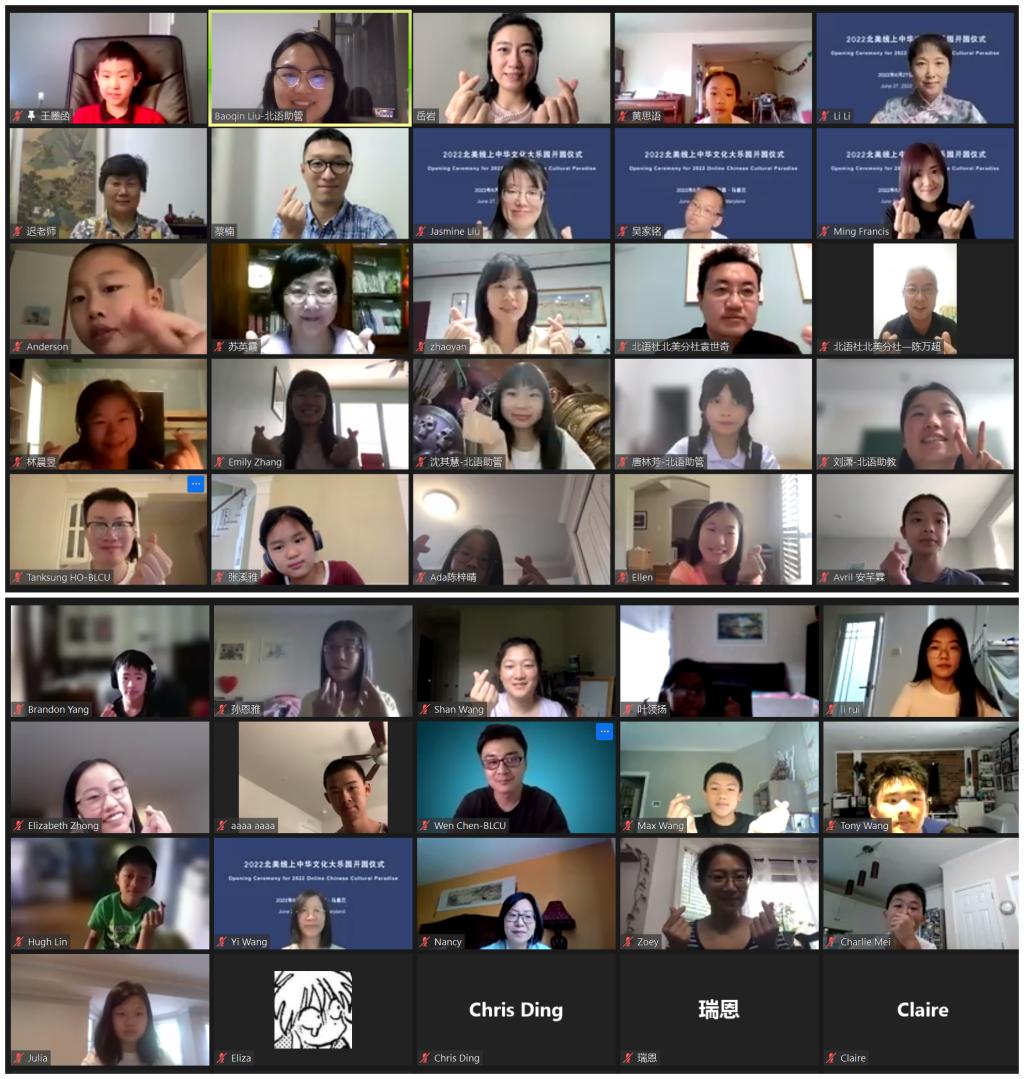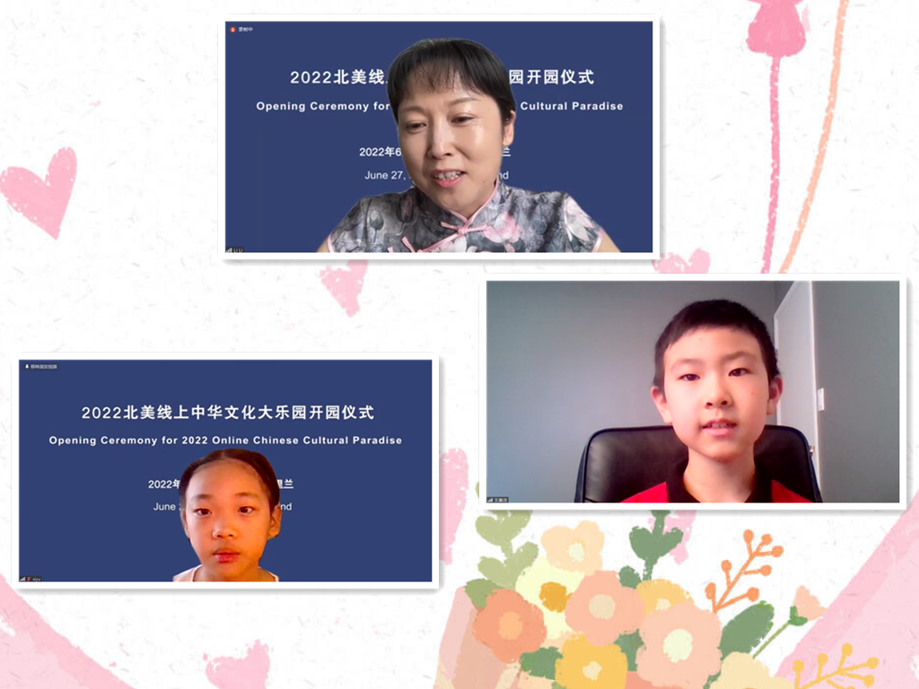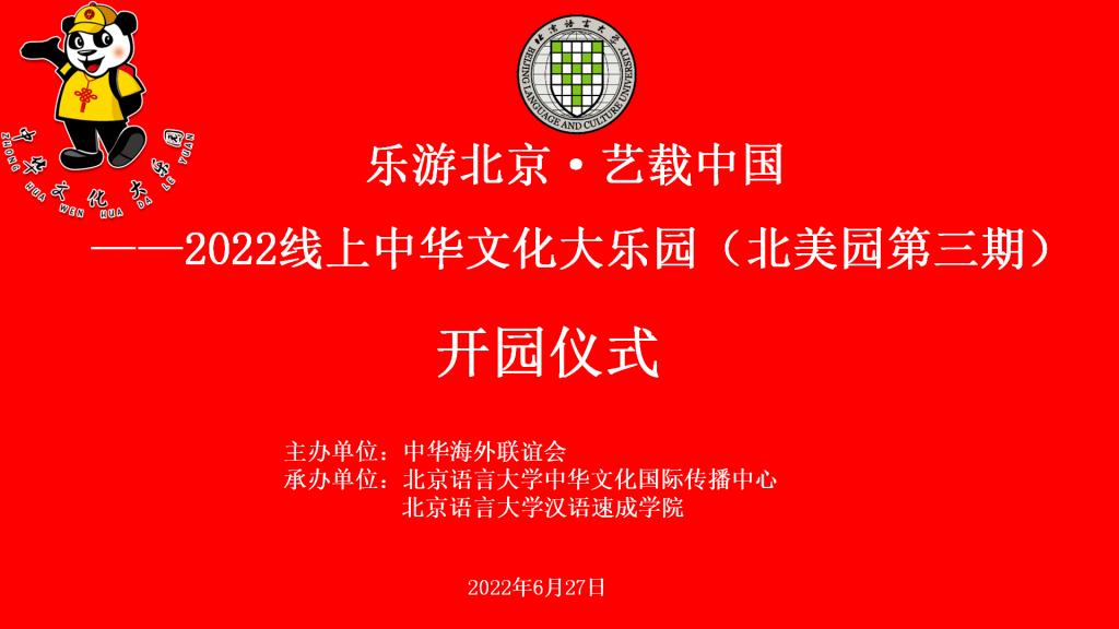 6月27日晚九点,由中华海外联谊会主办、北京语言大学中华文化国际传播中心和汉语速成学院承办的“乐游北京·艺载中国——2022线上中华文化大乐园(北美园第三期)”隆重开园。北京语言大学中华文化国际传播中心主任迟兰英、汉语速成学院院长苏英霞,美国马里兰中文教育学院院长李莉,北京语言大学和北京市有关教育机构的教师联合组成的教师团队代表,还有来自美国和加拿大的254位华裔和友族青少年以及中美方志愿者参加了开园仪式。开园仪式由中华文化国际传播中心项目主管岳岩主持。