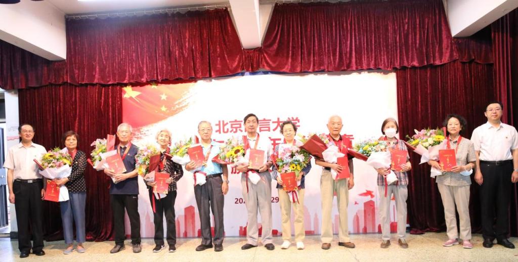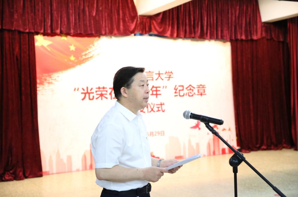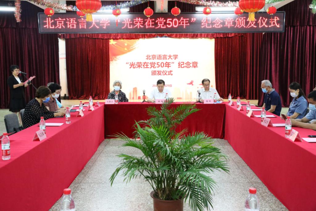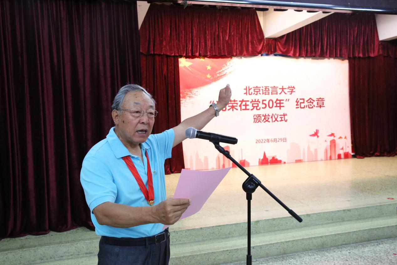 仪式在雄壮的国歌声中拉开序幕。校党委副书记、校长刘利代表学校党委向12名获得纪念章的老党员同志表示热烈的祝贺和崇高的敬意。他指出,在中国共产党成立101周年到来之际,隆重举行“光荣在党50年”纪念章颁发仪式,充分说明了党中央对老党员的关怀,体现了党和人民对老党员做出贡献的充分肯定。在党的波澜壮阔的历史进程中,老党员们是见证者、先行者和奋斗者,是我们党的宝贵财富,在各项事业中、在各自不同的岗位上勤勤恳恳、默默奉献50余年,用实际行动诠释了对共产主义的坚定信念,诠释了对党和人民的绝对忠诚,为新时代党员干部树立了学习的榜样。学校党委高度重视老党员和老同志各方面工作,用心用情,把对老党员的关心落到实处。今年我们党将召开二十大,这是党和国家政治生活的大事,目前学校正在为建设中国特色世界一流语言大学而努力奋斗,北语也即将迎来建校60周年校庆,希望广大老党员继续发挥政治优势、经验优势,在照顾好自己的同时,一如既往地关心支持参与学校的改革发展。