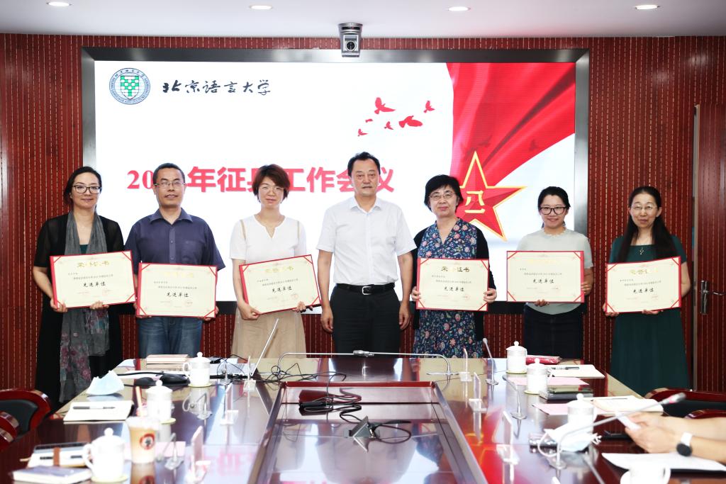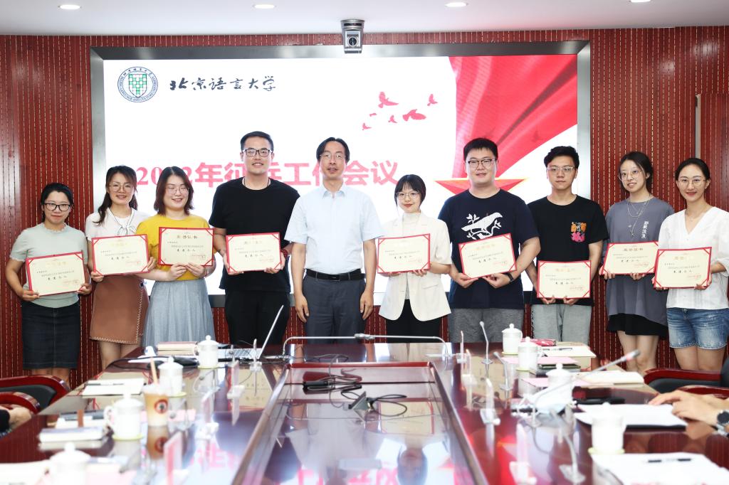 会议最后举行了北京语言大学2022年度征兵工作先进单位及先进个人表彰仪式,倪海东书记为获得“征兵工作先进单位”荣誉称号的外国语学部、教师教育学院、国际关系学院、商学院、艺术学院、语言康复学院等六个单位颁发证书,黄益方副校长为获得“征兵工作先进个人”荣誉称号的杨柯、唐诗琪、王慧媛、刘慧璐、党秀冬、曹依帆、刘文韬、朱衍行、曹文潇等九名辅导员颁发证书。