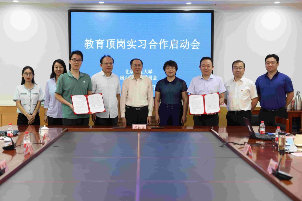 我校就业创业指导中心主任、学生处副处长刘喆与房山区教育委员会人事科科长高吉尧在双方参会人员见证下签署顶岗实习合作协议。