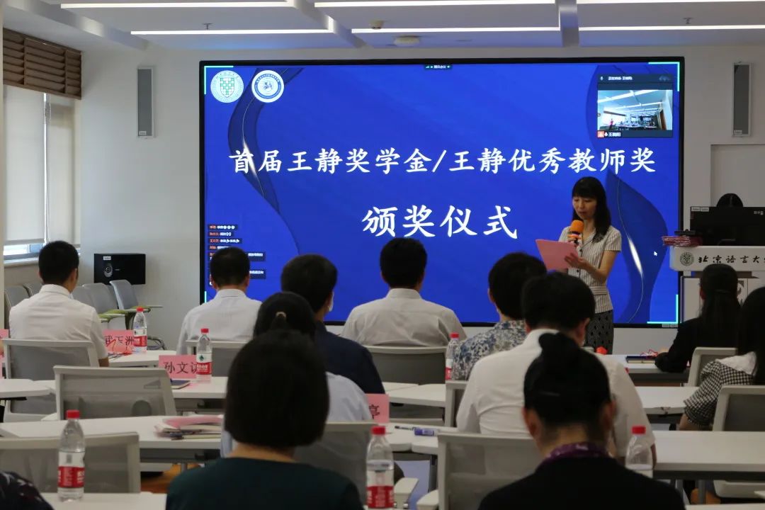 此后,首届王静优秀教师奖/王静奖学金颁奖仪式举行。院长施家炜教授介绍了奖项的来源,并表达了对捐赠人北京语言大学原党委副书记王静老师的崇高敬意。教育基金会副主任石鑫在致辞中同样饱含对王静前辈的敬意和深情。学院杨玉玲教授、郭晓麟教授获首届“王静优秀教师奖”;吴宇婷、王曼茜两位同学获首届“王静奖学金”。王静老师通过视频祝贺获奖教师和同学,勉励师生为国际中文教育、为构建人类命运共同体做出更大的贡献。