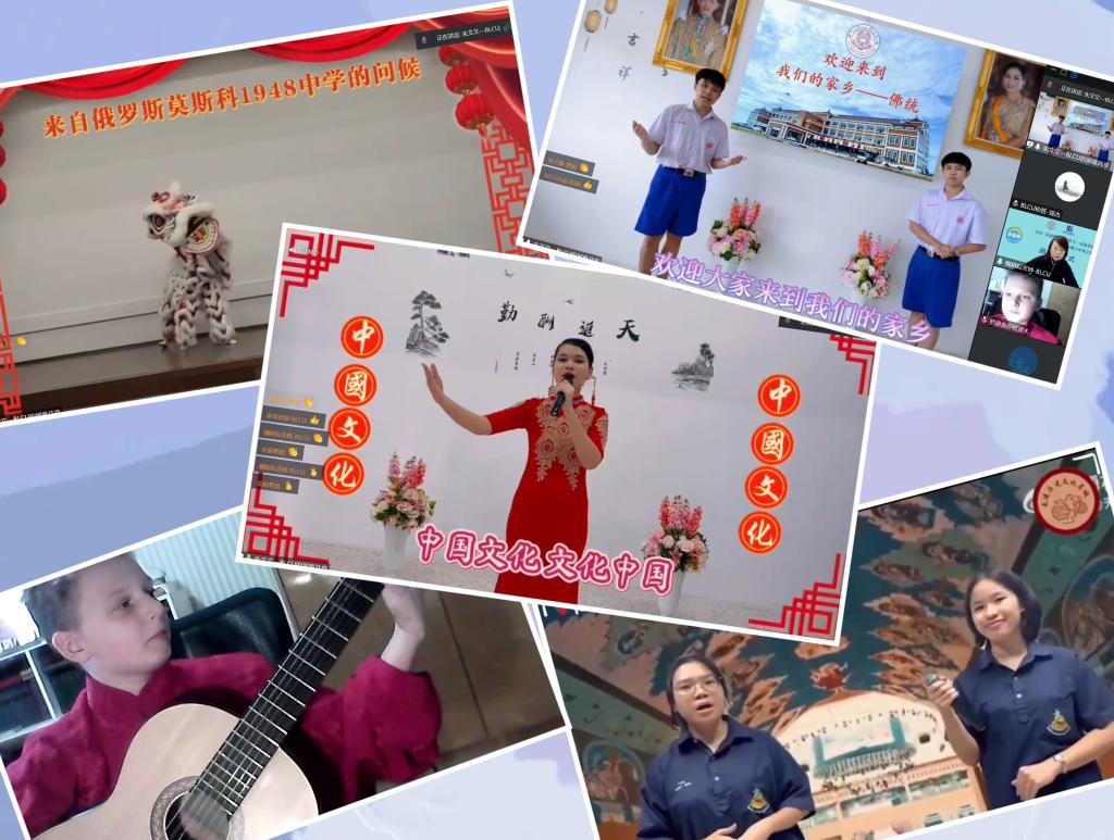 在闭营仪式上,营员们也在现场饱含深情地表达了对秋令营的喜爱以及对项目组老师、组织者和志愿者的衷心感谢。来自俄罗斯的营员代表娜斯佳特意穿上了中国的传统旗袍,她在发言中热情地表达了对中国的热爱,并感谢老师们以耐心、爱心和有趣而高效的教学方法进一步提高了自己的汉语水平,丰富了自己对中国文化的认识和了解。泰国营员代表徐晓华同学觉得此次秋令营活动对自己来说意义非凡,不但让自己学到了很多有用的知识,而且还进一步激发了自己继续努力学习中文和中国文化的热情。泰国营员代表李美吟同学感谢此次项目给了大家一个学习中国丰富多彩的文化,了解中国悠久灿烂的历史,体会现今中国高速发展的现代文明的宝贵机会。她还提到,北京语言大学老师们的精彩授课给同学们留下了非常深刻的印象。作为马上就要高中毕业的学生,她和很多同学都已经下定了决心要来中国留学,更希望明年九月他们之中有能够到北语留学的幸运儿。随后,营员们还争先恐后地为大家展示了自己的学习成果。俄罗斯莫斯科1948中学的营员们矫健敏捷、威风凛凛的舞狮表演令大家大为惊叹。罗迪翁同学为大家带来了吉他演奏《喀秋莎》,在中俄两国都脍炙人口的乐曲令很多同学和老师都忍不住轻轻哼唱。泰国同学陈灵儿、徐丽雅和黄鹏发、吴有财化身导游,分别为大家介绍了两座历史文化名城:中国新疆的库车和泰国的佛统府。他们流利的汉语、活泼生动的表达方式和精心制作的视频不仅让大家领略到两座城市悠久的历史、美景美食和独具特色的民俗文化,而且让大家深切感受到了此次秋令营项目为不同国家的文明交流和互鉴提供了有益的平台。最后泰国同学李美吟以一曲饱含真情的《文化中国》唱出了营员们对中国文化的真挚赞美:自强不息蓬勃、厚德载物祥和、百花齐放红火、五洲和美同乐。