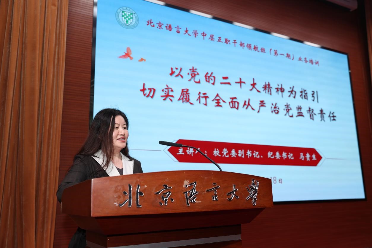 11月18日下午,北京语言大学举办中层正职干部领航班(第一期)业务培训第三讲,邀请学校党委副书记、纪委书记马贵生为领航班学员作题为“以党的二十大精神为指引 切实履行全面从严治党监督责任”的专题辅导报告。全体中层干部参加报告会。报告会由领航班党支部书记、宣传部常务副部长黄展主持。