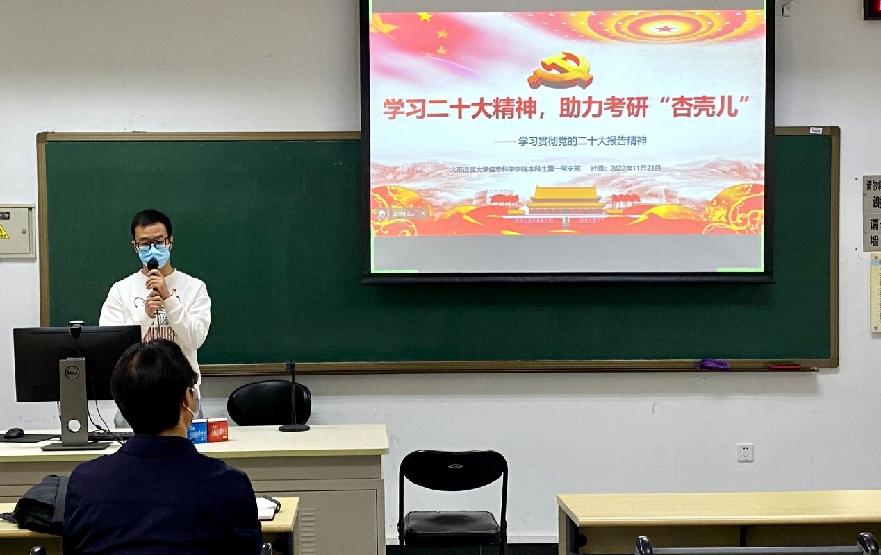 为深入领会党的二十大精神,11月23日中午,信息科学学院本科生第一党支部主题党日活动在主南103教室顺利进行。此次党日活动是党的二十大专题学习活动,旨在增强支部成员对党的二十大精神的领悟,激励支部成员进一步学习贯彻党的二十大精神。北京语言大学党委常委黄益方副校长、信息科学学院党委李超书记参加了本次活动,参加此次活动的还有信息科学学院党委副书记、本科生第一党支部书记李吉梅老师,以及本科生第一党支部的全体成员。