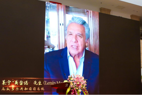 厄瓜多尔共和国前总统莱宁·莫雷诺通过视频致辞,他称赞北语为世界189个国家和地区培养了二十多万国际学生,将智慧之光洒向了世界的每个角落。他肯定北京语言大学与基多-圣弗朗西斯科大学的合作,希望未来各位同学带着在北语学习到的良好道德与品质,一同向善、同爱人类命运共同体,带着希望迈向前程。