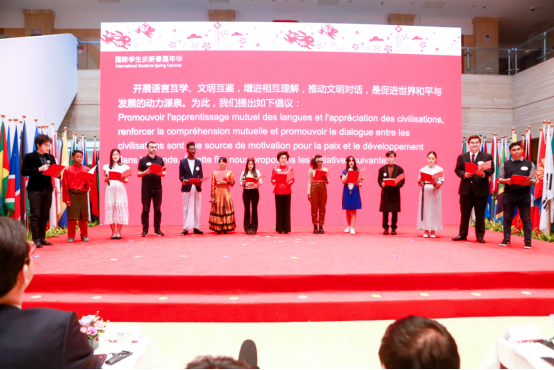 各国语言饱含激情的朗诵,最后汇聚成汉语的共鸣“青年是国家的希望。让我们共同携手,互学互鉴,铺就语言沟通之路,架设文化交流之桥,共同创造更加美好的未来!”